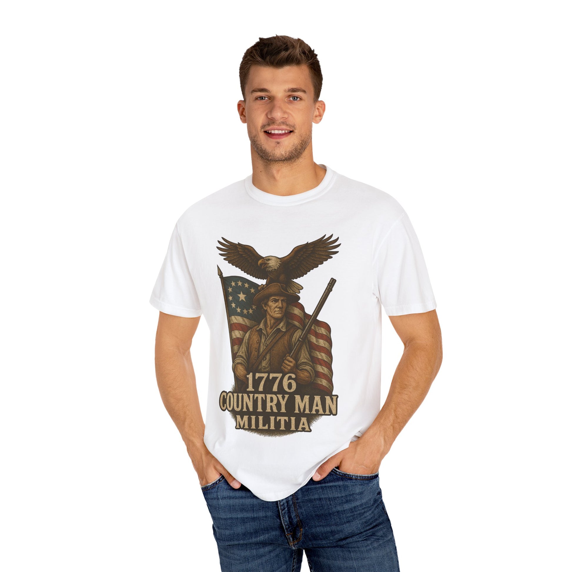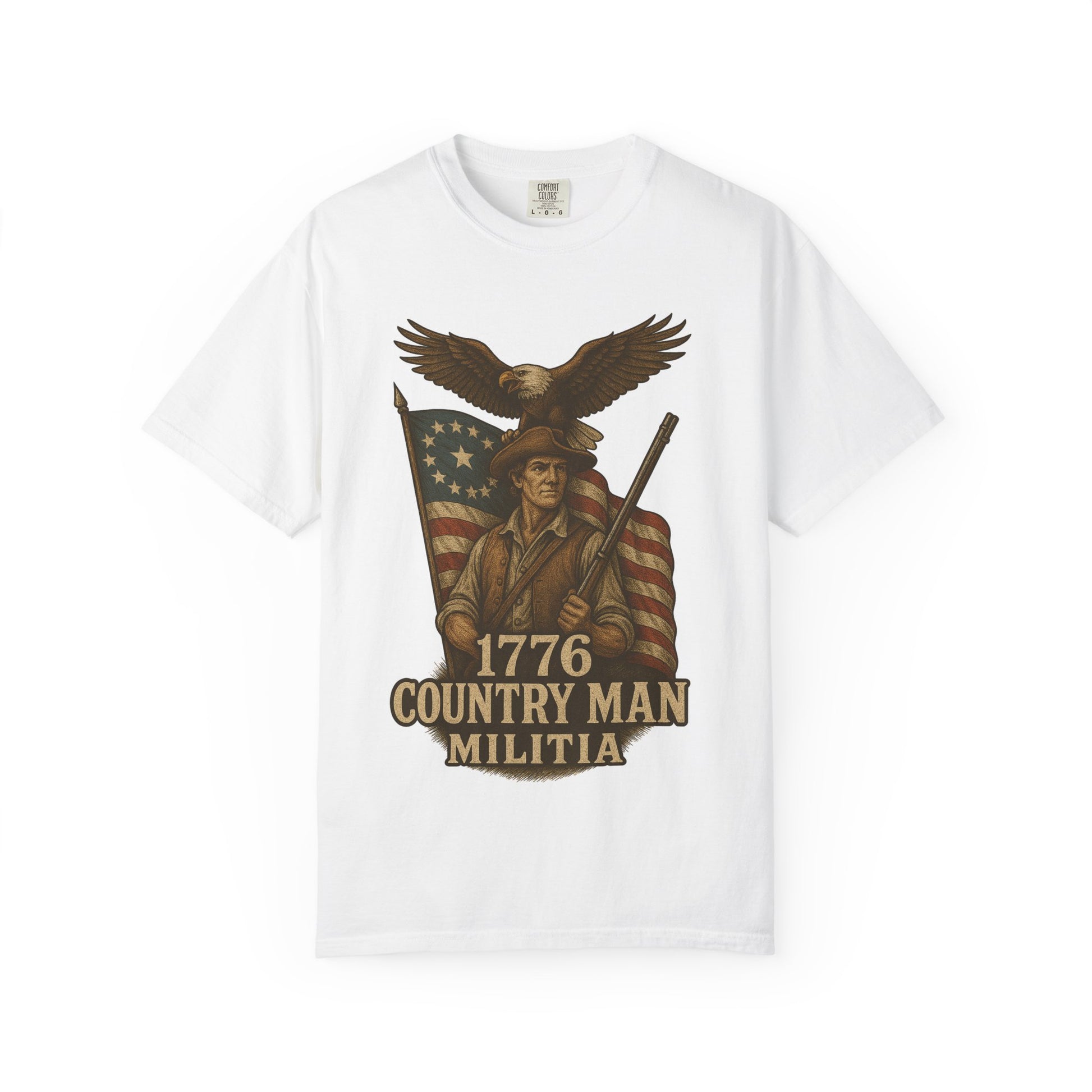Pay tribute to America's origins with the striking 1776 Country Man Militia T-shirt—a strong symbol of patriotism and tradition. Highlighting a classic American flag, a proud bald eagle, and a Revolutionary War soldier, this design captures the essence of freedom, faith, and rugged patriotism. An ideal choice for veterans, patriots, and anyone committed to honoring the red, white, and blue.